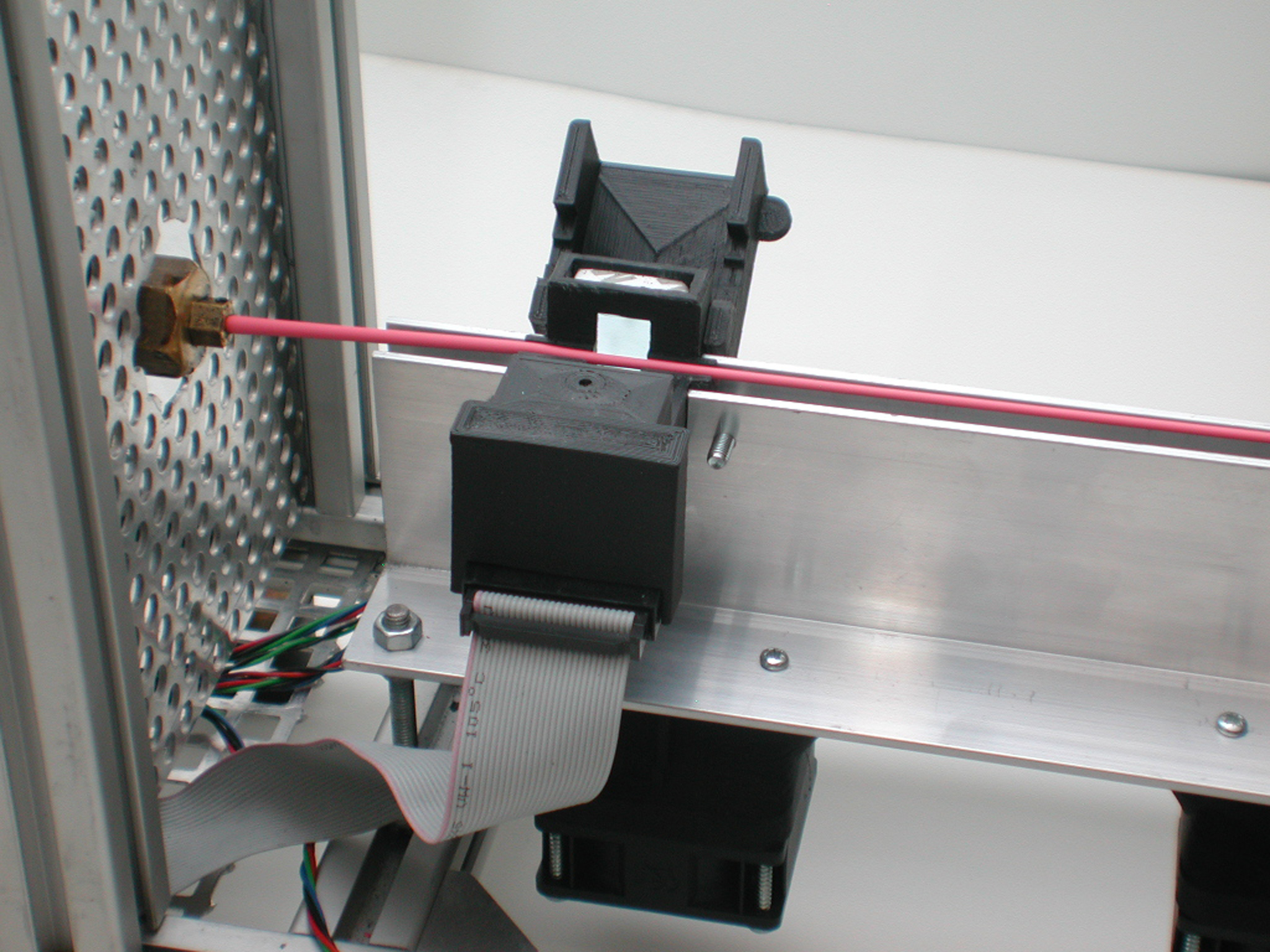 Der extrudierte Draht wird durch einen Schrittmotor (Advance) an der Kamera vorbei über einen Luftkühlkanal gezogen.