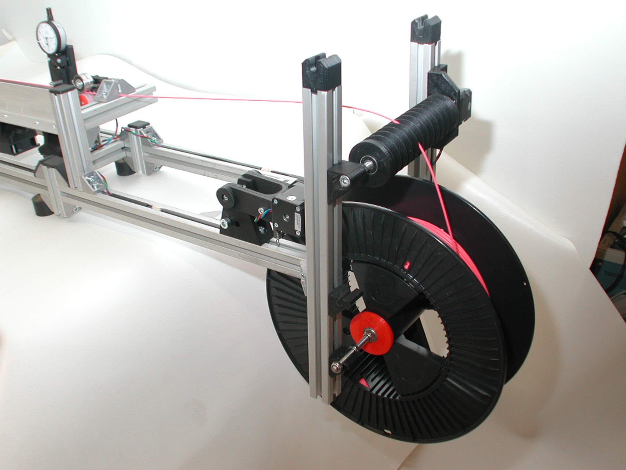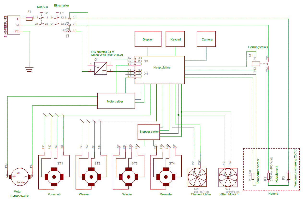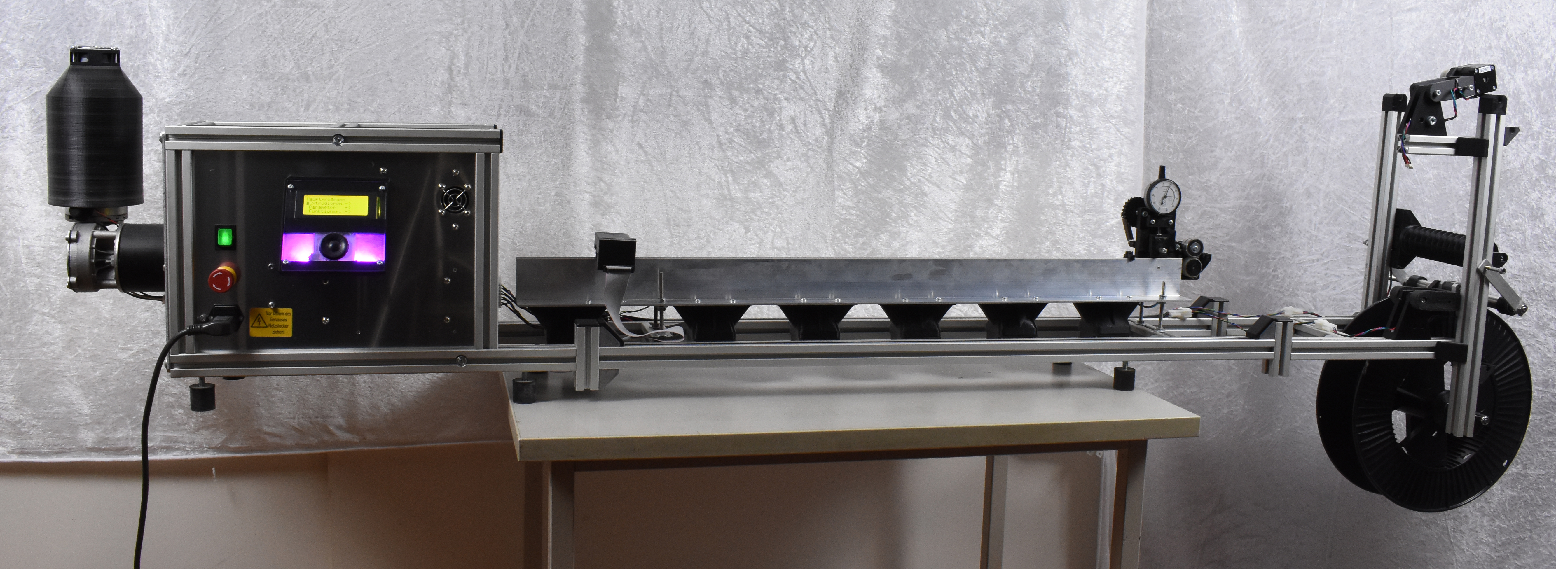 Ein weiterer Schrittmotor (Winder) treibt die eine Vorratsrolle an, auf der der extrudierte Draht aufgewickelt wird.
